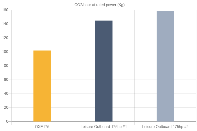 The reduced fuel consumption is a key factor to why the OXE Diesel engine emits significantly lower CO2 than a gasoline outboard engine. One litre of diesel produces approximately 2.69kg CO2 and one litre of gasoline produces 2.36kg CO2 when ignited. Since the OXE175 consumes less fuel than petrol alternatives, it can reduce CO2 emissions by up to 34.5%.